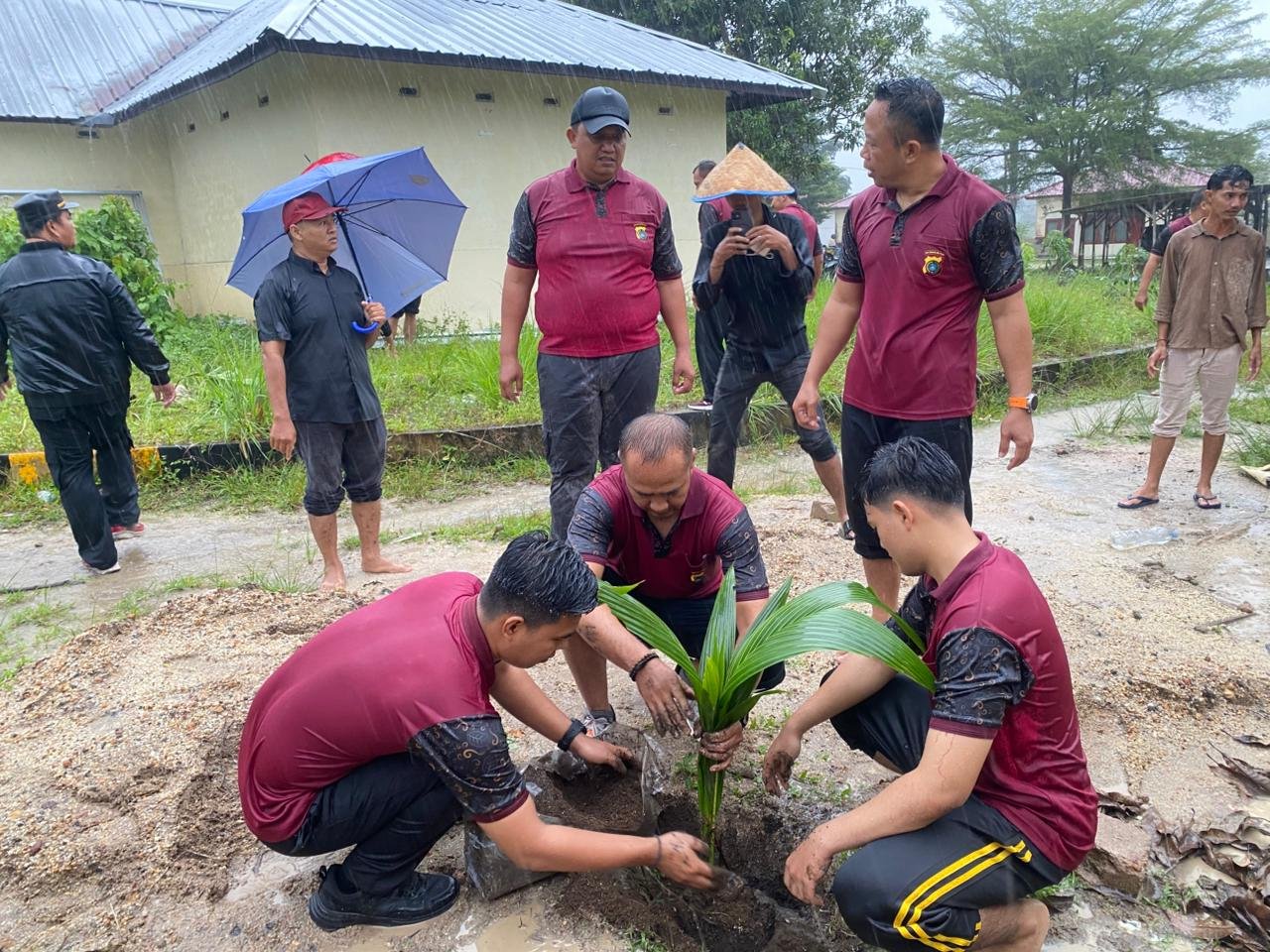 Penanaman bibit pohon dilakukan secara simbolis oleh Kapolres Bangka Barat dan dilanjutkan oleh para PJU serta personel Polres Bangka Barat dengan penuh semangat meski diguyur hujan deras.